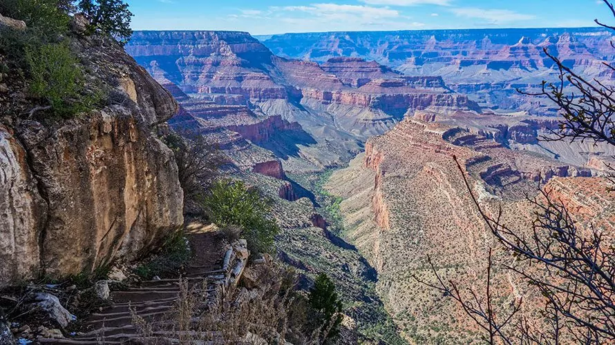Walking in the footsteps of prehistoric Native Americans, we follow an ancient trail through the Bright Angel Fault. Today’s trail offers a meandering descent into the Grand Canyon and is the most accessible trail that goes far below the rim. There are two potential turn-around points which can make the hike 3 miles or 6 miles round trip. This is a great trail to get down into the Grand Canyon and has great amenities like water, bathrooms and shade available intermittently.
