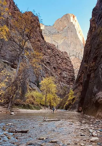 We will begin the day by traveling to The Temple of Sinawava, the furthest point into the canyon. Here we will hike along the majestic Virgin River, perhaps dip our toes into its famous “Narrows,” and get your first up-close introduction to Zion’s iconographic Navajo sandstone.