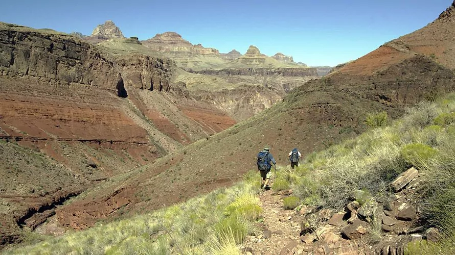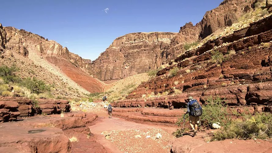 This trip is Level 4 on the way down and Level 5 coming back up. The way up is on a steep, very rugged, unmaintained trail that at times requires the use of arms. It has significant heights exposure in places and may require hiking in 105+ degree fahrenheit temperatures (May-Sept).