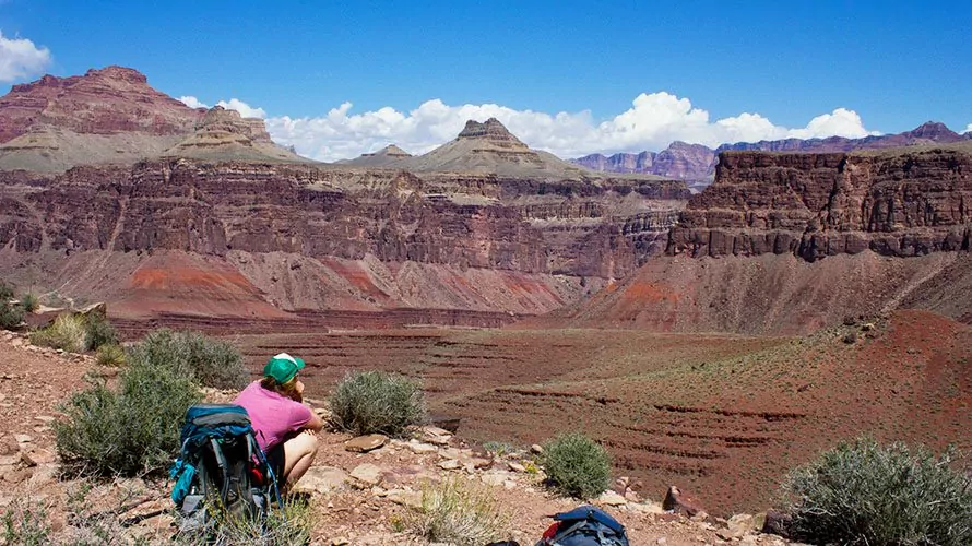 The next leg of our hiking trip takes us east on the Tonto Trail to the Colorado River. This is the eastern beginning of dramatic Granite Gorge. We’ll camp in Red Canyon or by the Colorado River, depending on the day’s hiking progress. Red Canyon’s lower elevations are predominately Hakatai Shale, undoubtedly the most brilliant crimson of any formation in the Canyon. The final day sees us ascending back to the South Rim on the New Hance Trail. Give us a call at 1-800-715-HIKE (4453) to learn more or book a spot on this exceptional Grand Canyon backpacking trip!